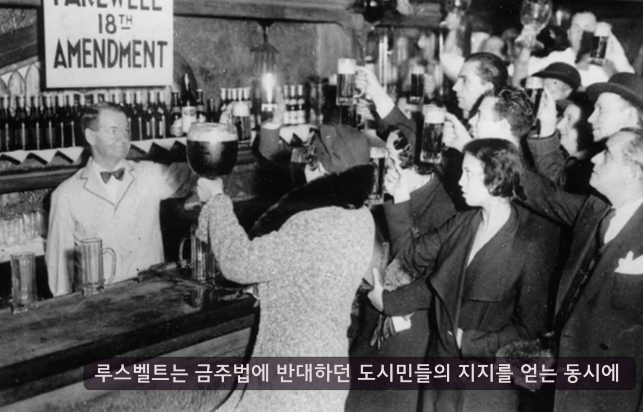 금주운동의 성과로 1920년 여성의 참정권 보장과 함께 0.5% 이상 모든 알코올의 제조 유통 판매를 금지하는 수정헌법 18조가 탄생하게 됩니다.
