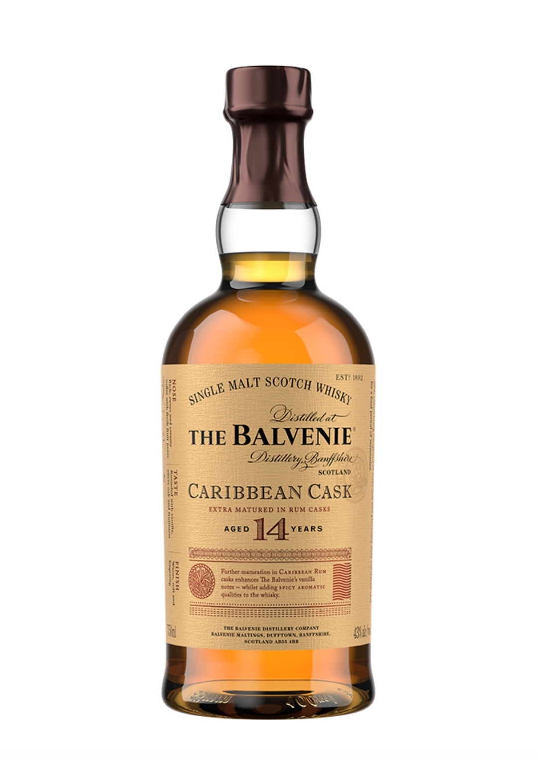 발베니 12녀과 같이 시중에 많은 발베니 14년 캐리비안은 버번위스키 오크통에서 14년간 숙성하고 럼케스크에 넉달간 숙성을 했습니다.토피향과 바닐라 향과 과일의 푸르티함으로 깔끔한 풍미가 있습니다.