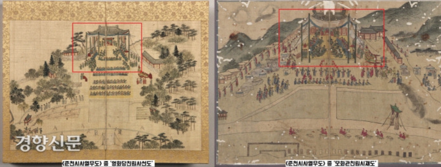 임금님의 천막을 용봉차일이라고 합니다. 용과 봉화이 그려져 있는 천막으로 나라의 중요한 잔치가 있을 때 사용하는 것입니다.