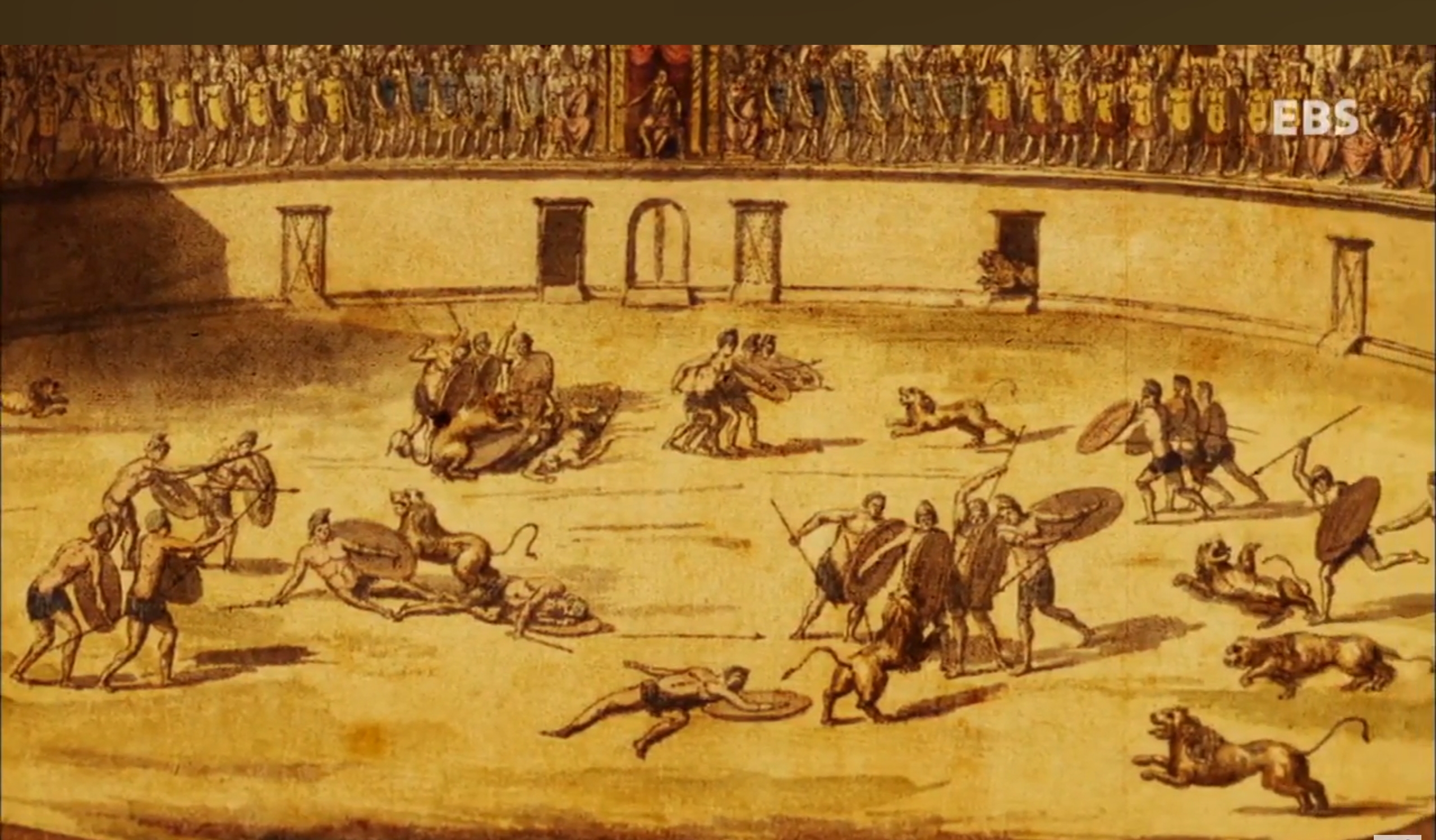 검투사들이 맹수를 사냥를 하는 공연도 이었습니다. 주로 중동에서 수입한 코뿔소, 타조, 호랑이, 사자등 매우 다양한 동물들과 검투사가 사투를 벌이는 관경을 보고 시민들은 열광했습니다.