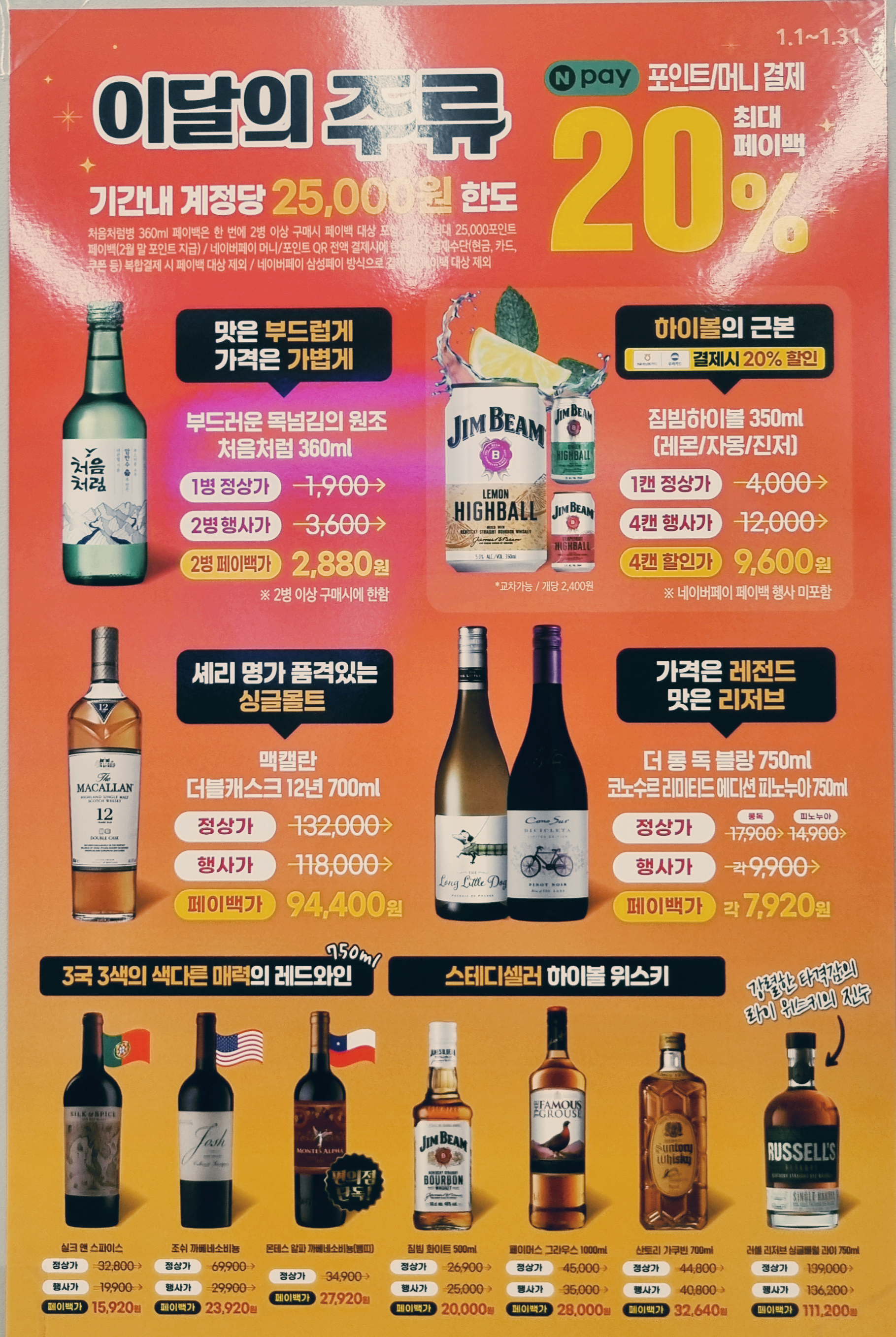 할인 행사하는 주류들을 네이버 머니로 구입하시면 할인 행사가에서 또 20% 할인됩니다.   페이벡이어서 네이버머니로 결제하시면 할인가격으로 결제되시고 20%로 할인되는 금액은 다음 달 네이버로 적립되는 방식입니다.
